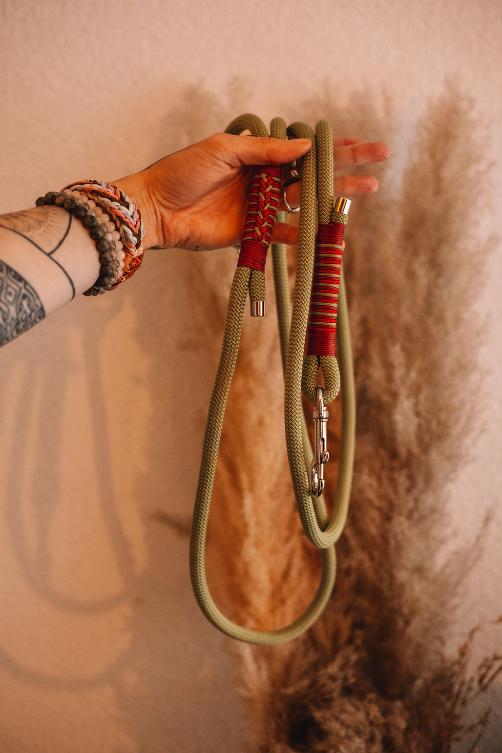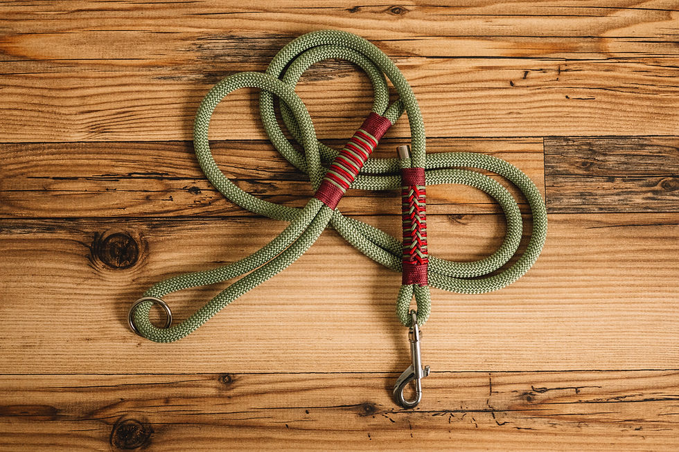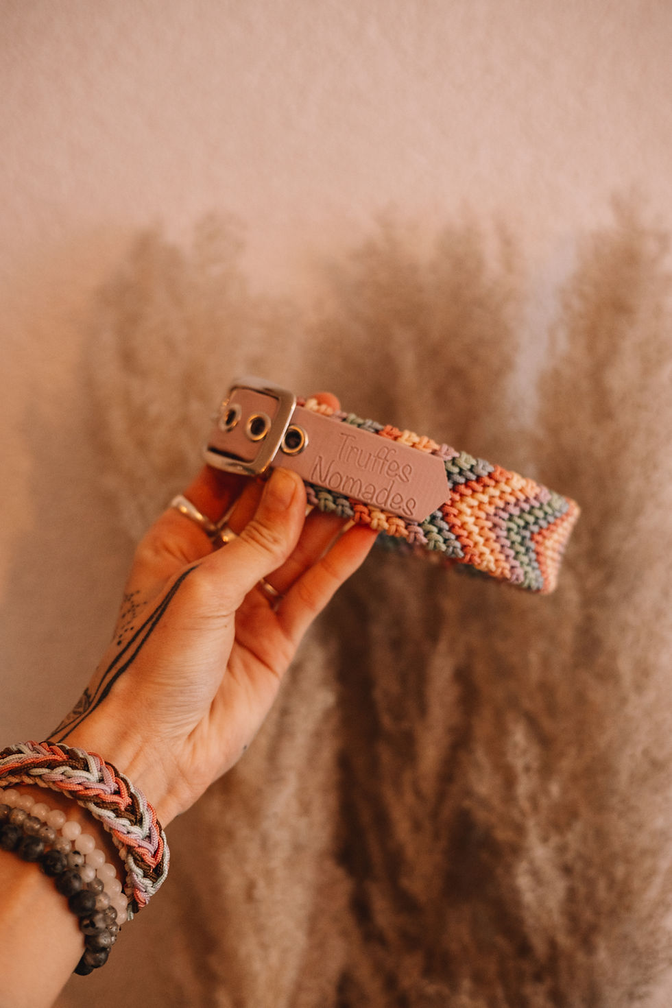 Je crée tout de A à Z : le choix des cordes, du BioThane®, des boucles en fonction de la taille et du poids du chien pour assurer une résistance de traction pour tous, le tressage, les découpes, les trous de réglages et l’assemblage. Tout ça de mes petites mains et de ma force parce que oui, il faut de la force pour trouer manuellement…